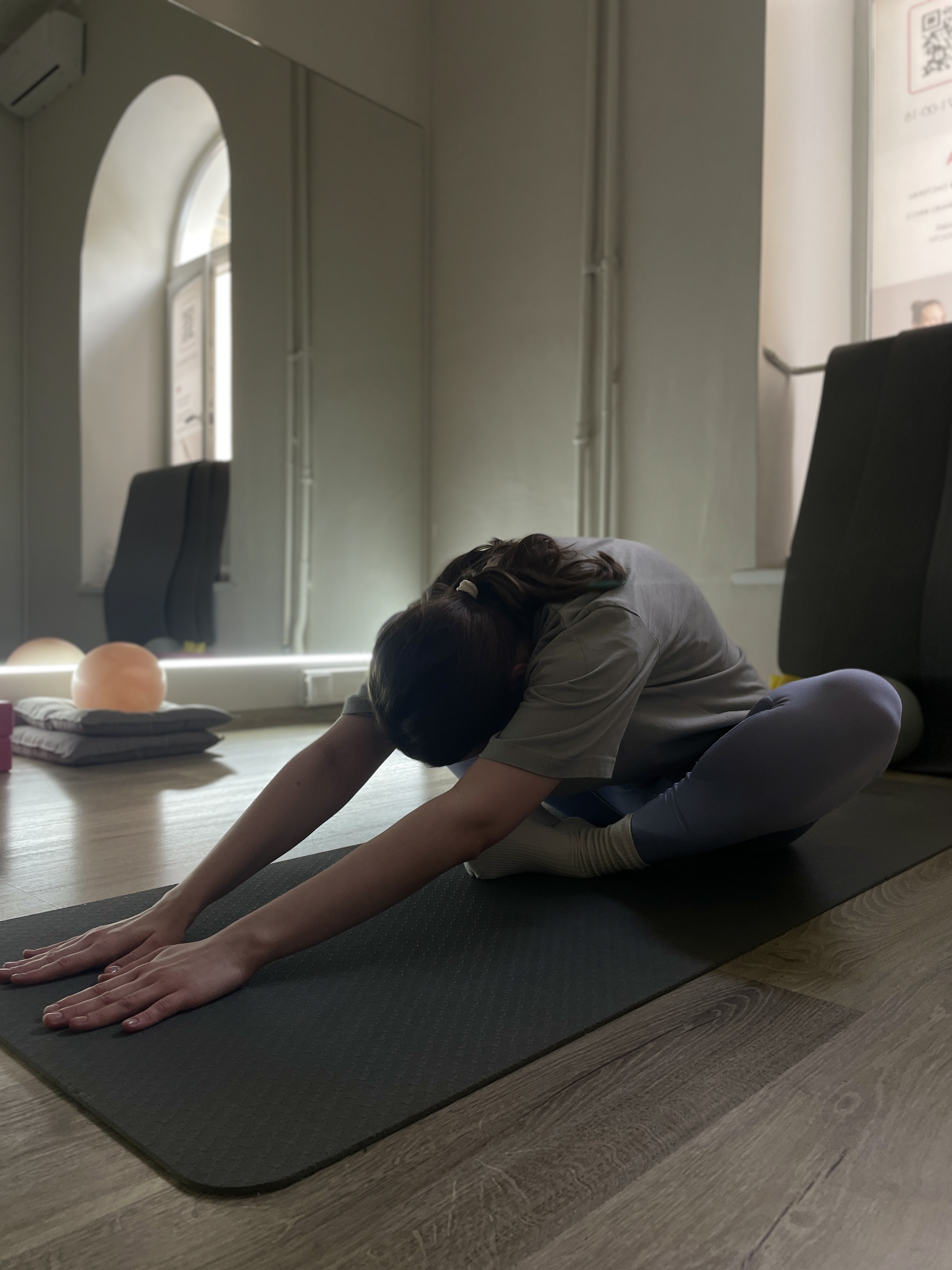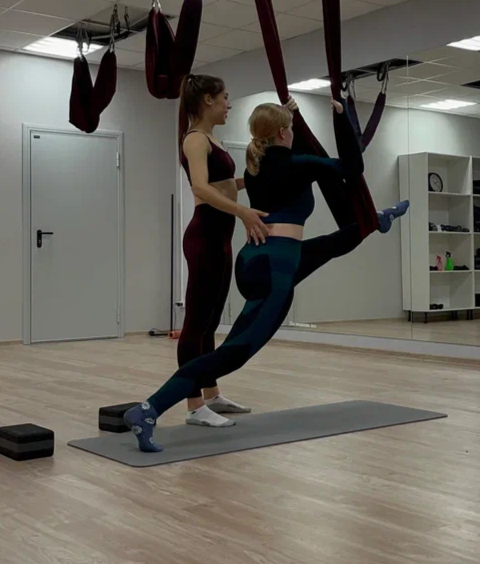 Мария пришла на занятия с несколькими целями. 1. Ни в одной студии её ни как не могли посадить на шпагат. 2. Хотела подтянуть фигуру.
